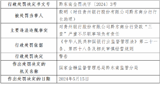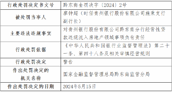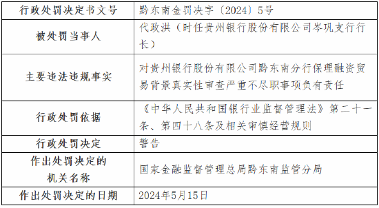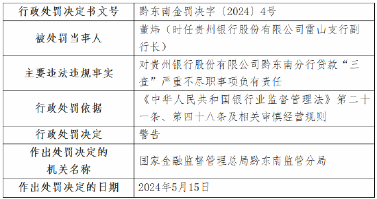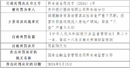 5月24日金融一线音书,国度金融监督处理总局黔东南监管分局行政处罚信息公开表走漏,贵州银行股份有限公司黔东南分行因保理融资交易配景确实性审查严重不遵法;蓄意性贷款违法流入房地产界限;贷款“三查”严重不遵法,被罚金70万元。 时任贵州银行股份有限公司施秉支行副行长廖钟超,对分行蓄意性贷款违法流入房地产界限事项负有背负,受到告诫。 时任贵州银行股份有限公司黔东南分行行长助理殷明,对分行贷款“三查”严重不遵法事项负有背负,受到告诫。 时任贵州银行股份有限公司雷山支行副行长董炜,对分行贷款“三查”严重不遵法事项负有背负,受到告诫。 时任贵州银行股份有限公司岑巩支行行长代政洪,对分行保理融资交易配景确实性审查严重不遵法事项负有背负,受到告诫。 时任贵州银行股份有限公司凯里宁波路支行行长吴章东,对分行贷款“三查”严重不遵法事项负有背负,受到告诫。