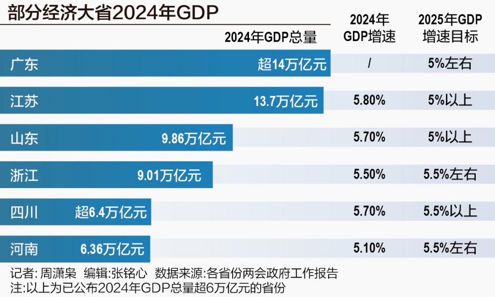 编者按: 经济大省2025年怎么干? 近日,多个省份陆续召开2025年省级两会,2025年经济社会发展主要预期所在厚重浮出水面。在设定经济增速所在的同期,各地政府责任证据中还明确了2025年的一系列重心任务。“扩大内需”“新质坐蓐力”“高水平盛开”等本体被时时说起,成为各地责任的重心。 近日,多个省份陆续召开2025年省级两会,2025年经济社会发展主要预期所在相应公布。 21世纪经济报说念记者梳剃头现,广东、上海、北京、天津、黑龙江、广西等省份2025年经济预期增速为5%傍边,江苏、山东、河北等2025年经济预期增速为5%以上,福建预期增速为5%~5.5%,浙江、河南、湖南2025年经济预期增速为5.5%傍边,四川预期增长5.5%以上。 2025年各省份主要预期所在还反馈了一些新的动态,比如社会破费品零卖总数增速与GDP增速大约非常,意味着在提振破费计策带动下,2025年各省份破费有望一改2024年偏弱的情势;一般群众预算收入增速精深低于GDP增速,意味着以现价预备的财政收入瞻望仍会受低物价影响;多省份公布的2025年住户破费价钱(CPI)涨幅在2%傍边,相较往年多为3%的物价所在有所下调——2024年我国CPI同比高潮0.2%,2025年稳健下调CPI涨幅所在,是求实之举。